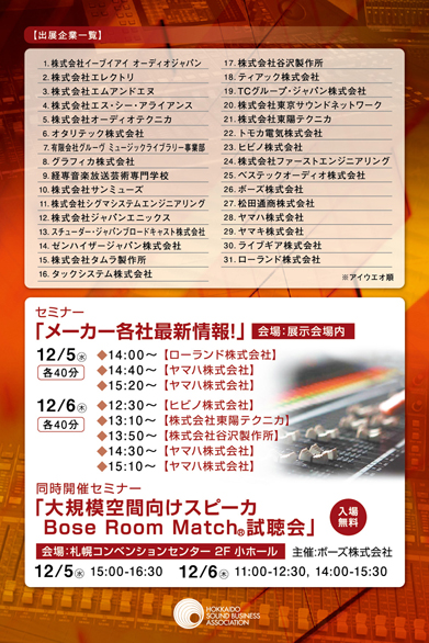 主催/北海道音響事業協会 協賛/日本舞台音響事業協同組合 北海道公立文化施設協議会 日本音響家協会北海道支部 日本舞台音響家協会 北海道音楽関連事業協会 |